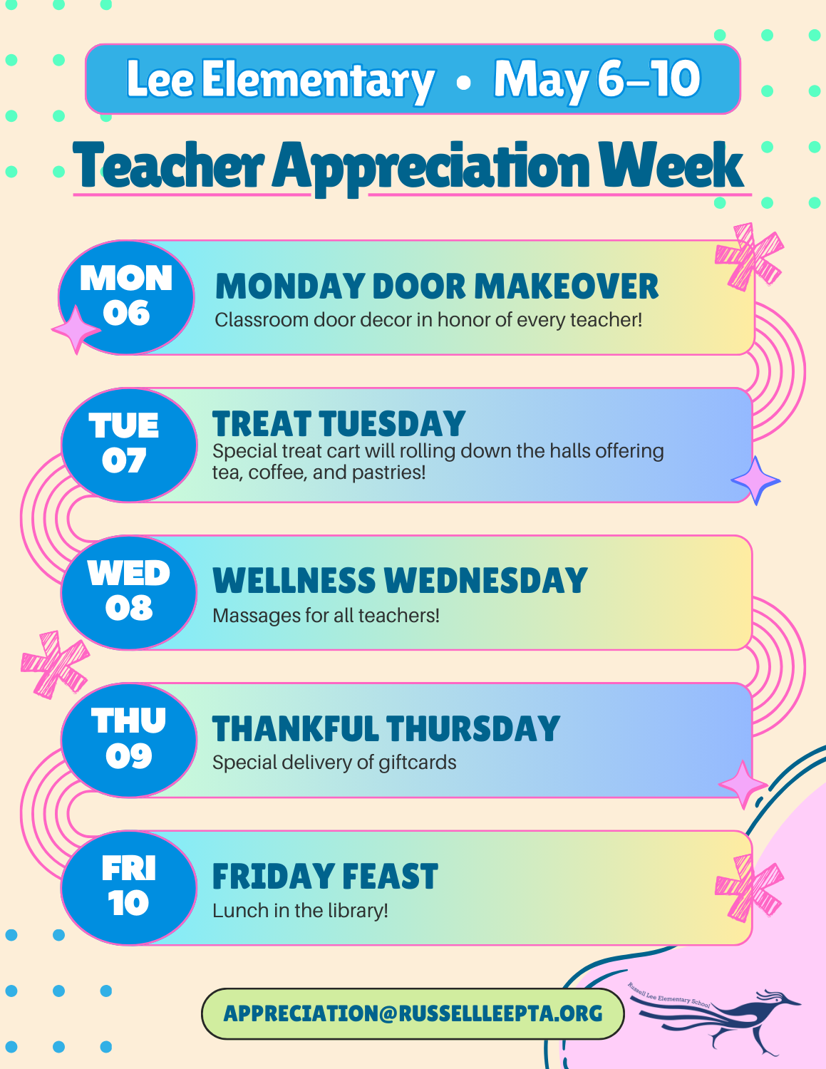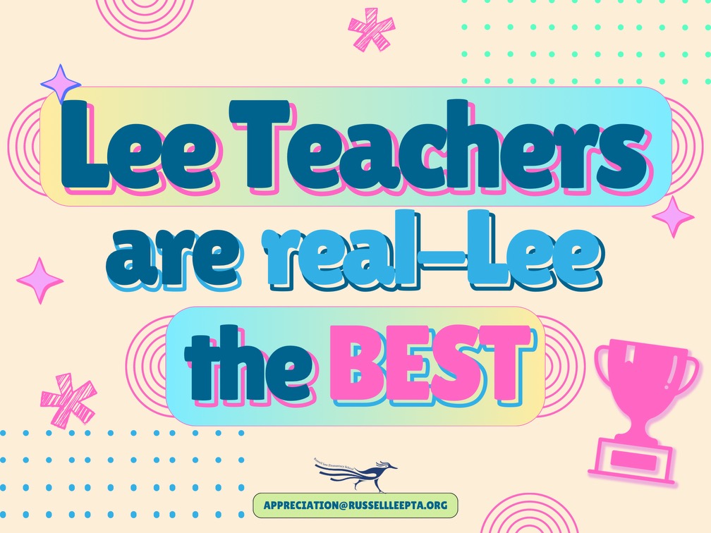Send photos from any Lee events to showcase here in the Rundown or on ParentSquare to the PTA here: https://forms.gle/AzUd5RJEZFJLSZLu5 or email directly to communications@russellleepta.org