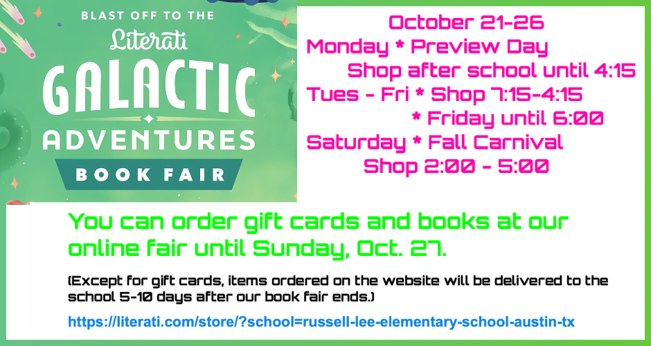 Next week is also Library Book Fair week! See Ms. Day's announcement below. AND it is the kick off of Cosmic Week in PE. IF that wasn't enough the Carnival is almost here. Have you signed up to volunteer? Are you attending? Are you entering the costume contest or the pumpkin contest? Get ready for an epic day at Lee! More on all of that below.